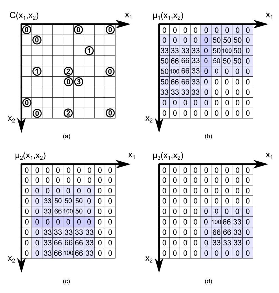 Figure 1: The structure of the FHM classifier for a 2-dimensional, 3-class problem – (a) location of known samples belonging to given classes 1…3 in the problem space, (b)-(d) fuzzy function values assigned to the given classes (0 and between 100)