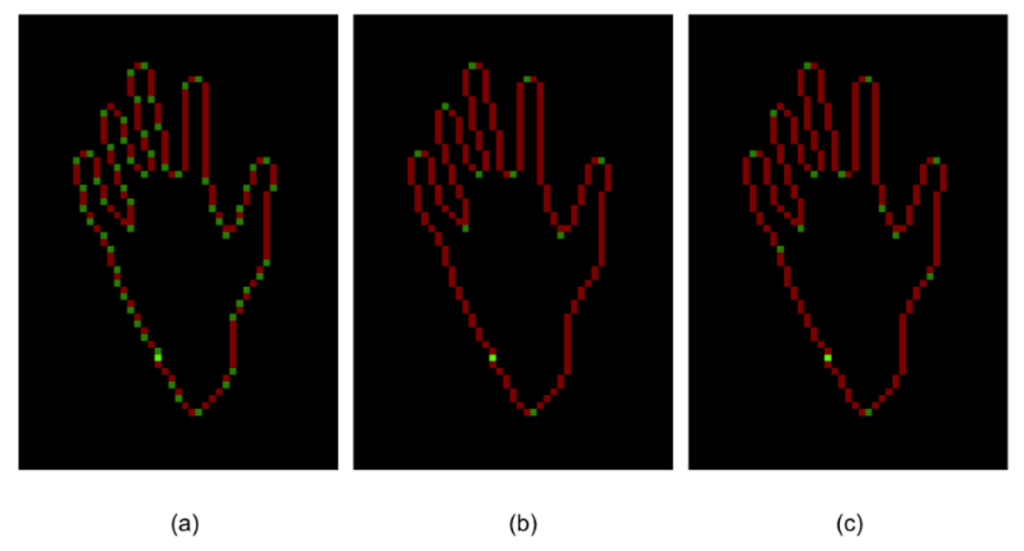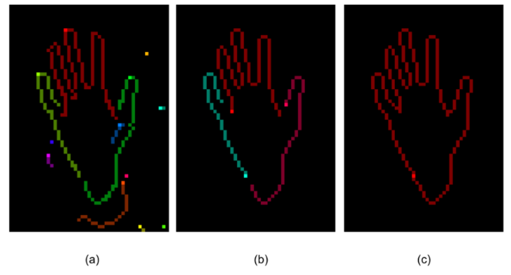 Figure 3: Construction of the contour of a hand – (a) Canny edge detector output, (b) simplified sequences created by back-pruning trees built from pixels, (c) the combined contour.