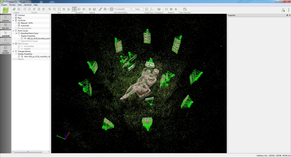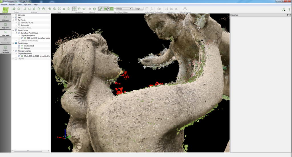 Figure 3.: 3D model creation steps (from top left): loading cameras and image, adding manual Tie points, model errors, removing errors by editing – removing point clouds