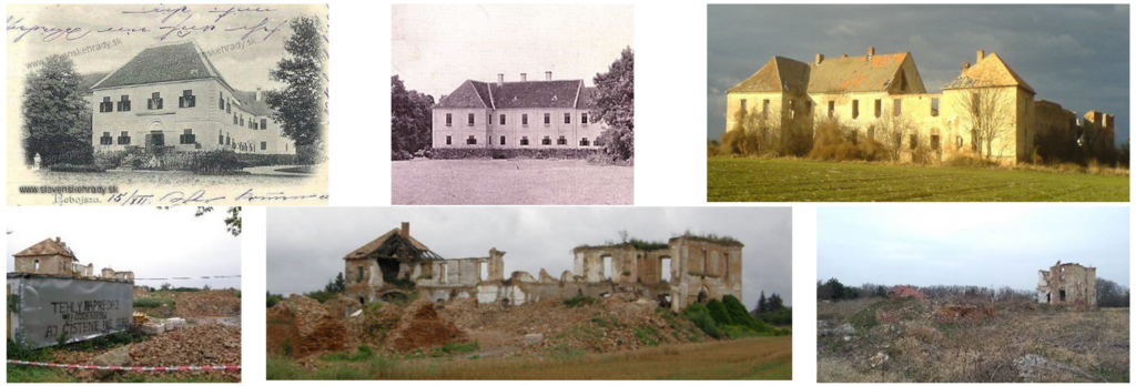 Figure 1.: “Nebojsa” mansion in Slovakia. From the left side from the top: The mansion from the postcard from 1899, the mansion from the postcard before 1945, the mansion in 2007, an inscription describing the sale of bricks, the abandonment and deliberate dismantling of the mansion, the rest of the mansion in 2022.